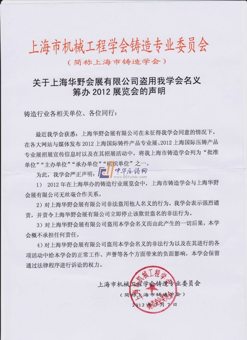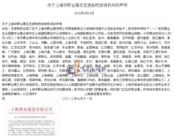 隨后,上海奧亞展覽有限公司在其網(wǎng)站發(fā)出聲明并做專題回應(yīng),指出華野此舉是為“誹謗”、“報(bào)復(fù)”。并力證華野盜用奧亞主辦單位—上海市機(jī)械工程學(xué)會(huì)鑄造專業(yè)委員會(huì)(簡(jiǎn)稱上海市鑄造學(xué)會(huì)),被學(xué)會(huì)發(fā)文通報(bào)一事;奧亞還貼出早前上海市鑄造學(xué)會(huì)所發(fā)的“關(guān)于上海華野會(huì)展有限公司盜用我協(xié)會(huì)名義籌辦2012年展覽會(huì)的聲明”。