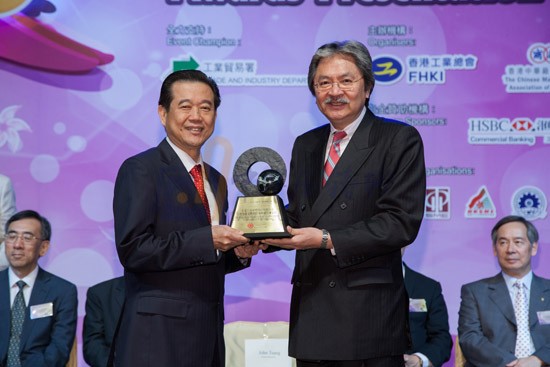 香港財(cái)政司司長曾俊華先生(右)為力勁集團(tuán)創(chuàng)始人劉相尚先生頒發(fā)"機(jī)器及機(jī)械工具設(shè)計(jì)大獎(jiǎng)”