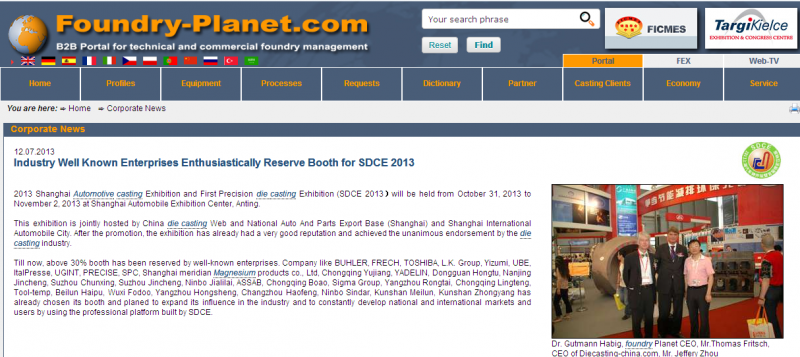 日前,2013上海汽車鑄件展暨首屆精密壓鑄展【SDCE2013】與德國《鑄造星球》達成戰(zhàn)略合作意向。《鑄造星球》作為SDCE的海外支持媒體,將利用其專業(yè)的網(wǎng)站平臺和多年來積累的會員數(shù)據(jù)庫為SDCE在德國進行宣傳推廣。