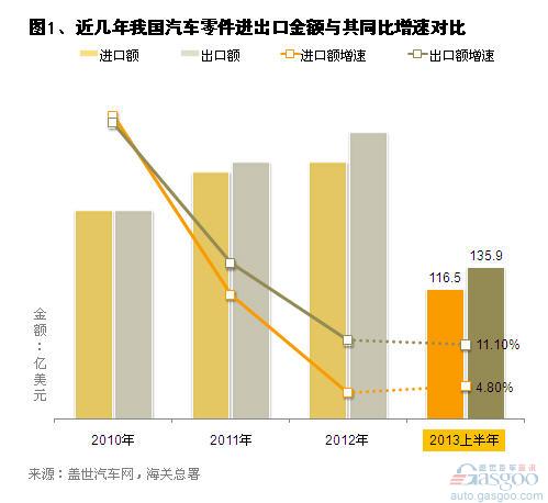 2010年,我國汽車零件順差僅有0.1億美元,而至2012年已擴大到27億美元,今年僅上半年順差已達19.4億美元,相信今年整年我國汽車零件的貿(mào)易順差將比去年進一步擴大。