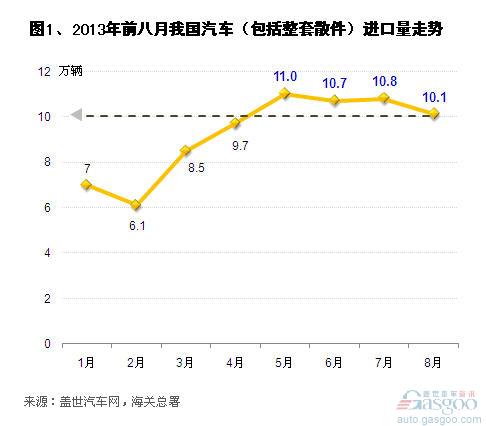 在宏觀經(jīng)濟的逐漸回暖,市場需求的回升以及進口車價格不斷走低等因素影響下,近幾月,我國汽車進口持續(xù)處于高位運行,進口量保持十萬輛水平。根據(jù)蓋世汽車網(wǎng)整理的海關總署數(shù)據(jù),今年8月,我國汽車(含整套散件,下簡稱為汽車)進口量10.1萬輛,已連續(xù)第四個月保持十萬輛規(guī)模。