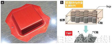 由過去的鑄件一邊,到為了滿足日益擴大的鎂合金壓延材料需求,利用日本金屬公司的自主軋制技術,開發其他公司所沒有的材料。能夠冷壓成形的板材“TMP”(Texturecontrolled Magnesium alloy Plate)就是其成果之一。這種材料跟必須熱壓成形的普通鎂合金不同,能夠冷壓成形〔圖(a)〕。其成分跟AZ31基本相同,因此在加工后科采用AZ31的表面處理和修飾方法。