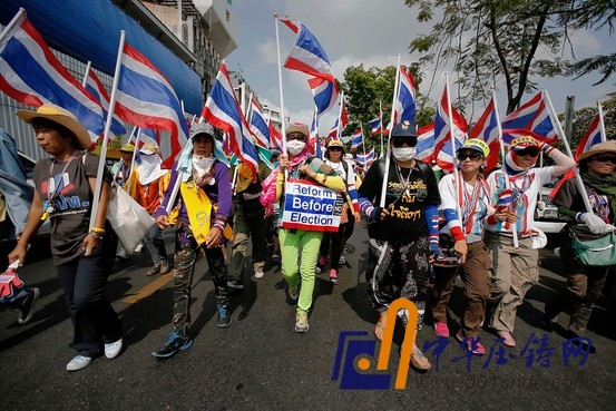外國汽車制造商警告說泰國政治動蕩將會沖擊它們在當?shù)氐匿N量。圖為上周五示威者在曼谷游行。
