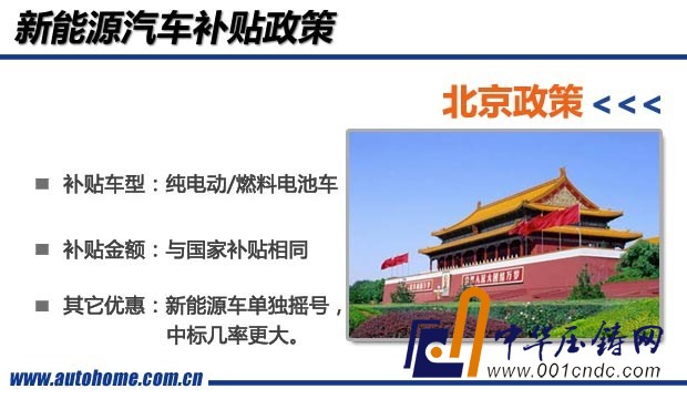 2014年1月,北京市政府出臺了《北京示范應用新能源小客車管理辦法》,政策顯示,在北京市購買新能源車的補貼與國家相一致,即按照國家和北京市1:1的比例確定補助標準,但需要注意的是,國家和北京市財政補助總額最高不超過車輛銷售價格的60%。