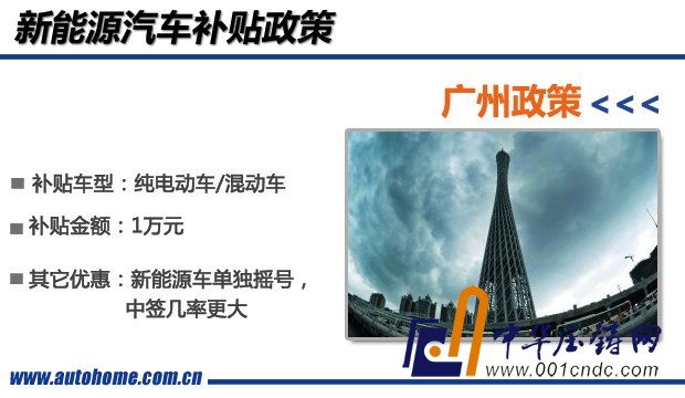 2012年,廣州市發布了《廣州市節能與新能源中小客車購置補貼試行辦法》,其中顯示,新能源中小客車和節油率超過20%的混合動力車型在辦理車輛注冊登記后,按每輛1萬元的標準給予購置補貼。雖然補貼金額較少,且補貼車型也需要進入工信部《節能與新能源汽車示范推廣應用工程推薦車型目錄》,但在車型方面包括了非插電式混動車型,理論上會有更多車型獲補貼。