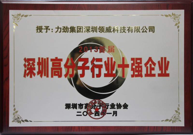 2014年1月16日,深圳市高分子行業協會舉行了“深圳高分子行業10強企業”授牌儀式,力勁集團–深圳領威科技有限公司憑借首屈一指的工業產值綜合指標斬獲殊榮。據悉,深圳市高分子行業協會組織行業專家學者成立的評選委員會,對數百家在本市注冊的規模以上的塑料原料、機械設備及制品企業,以近三年的營業額、凈利潤、利潤率、納稅額等多項主要指標作為參考標準,進行全面系統評審,最終評選出綜合指標排名前列的10家企業。深圳領威科技有限公司多項指標均名列前茅,成功入選“深圳高分子行業10強企業”。
