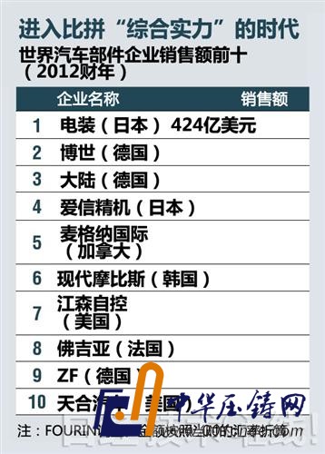 右表給出了全球銷售額排名前十的部件企業,日本企業只有電裝和愛信精機榜上有名。