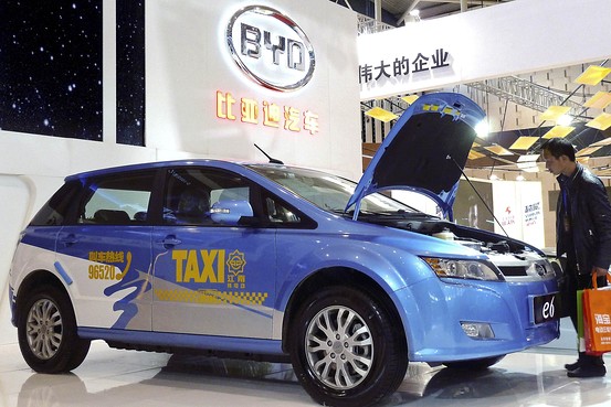 2014年3月22日,江蘇省南京市,一名參觀者在國際新能源汽車與電動車展覽會上了解比亞迪E6電動車。