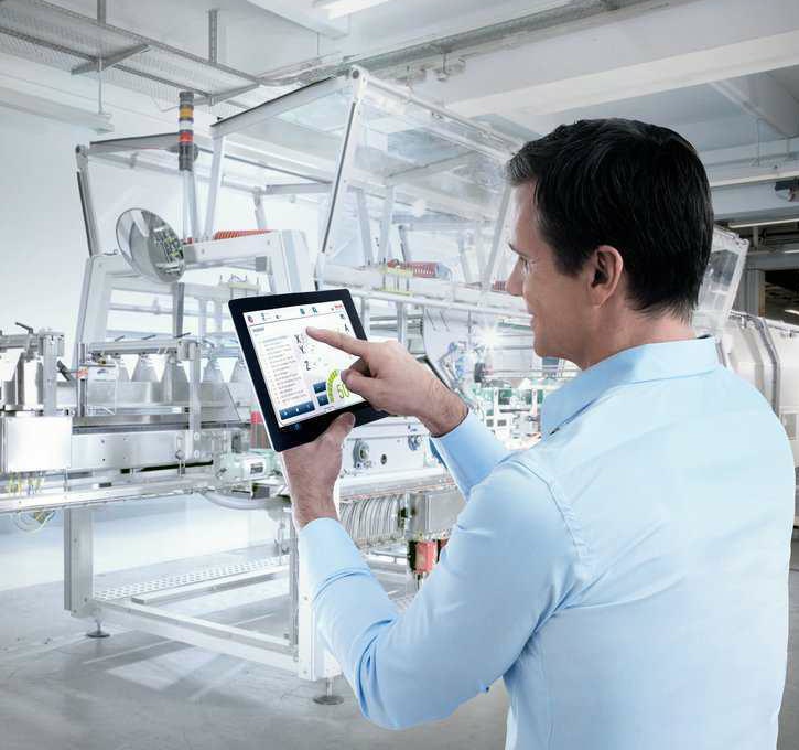 圖 4 為力士樂設(shè)想的將來的工廠,全自動車間,技師帶著平板電腦,利用無線網(wǎng)絡(luò),與各設(shè)備聯(lián)絡(luò),了解情況,調(diào)整狀況。