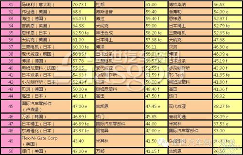 根 據(jù)各供應(yīng)商2012年在汽車配套市場(chǎng)的銷售額,排名顯著上升的供應(yīng)商除了日本矢崎外,還包括美國(guó)李爾(由14名升至11名)、日本捷太格特(由 21名升至18名)、德國(guó)舍弗勒(由26名升至21名)、西班牙海斯坦普(由32名升至25名)等;而排名顯著下滑的供應(yīng)商則包括由前十跌至12名的德爾 福、日本康奈可(由18名跌至23名)、意大利馬瑞利(由28名跌至31名)、日本恩梯恩(由29名跌至35名)、美國(guó)杜邦(由31名驟跌至59名)、日 本精工(由36名跌至47名)等。