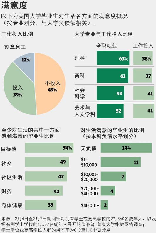 調查發現,只有39%的大學畢業生感覺對工作投入——意即他們每天都享受自己所干的工作,他們在情感上接納自己的工作,而且他們的工作與他們的才干很匹配。只有11%的人表示他們在生活的五個不同方面都“欣欣向榮”,這些方面包括財務穩定性、牢固的社交網絡和目標感等。
