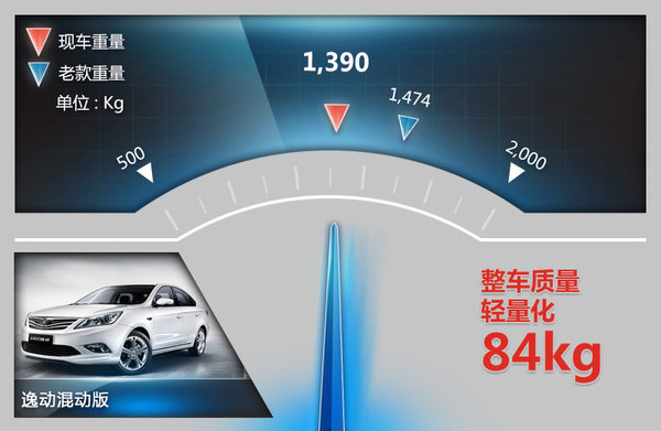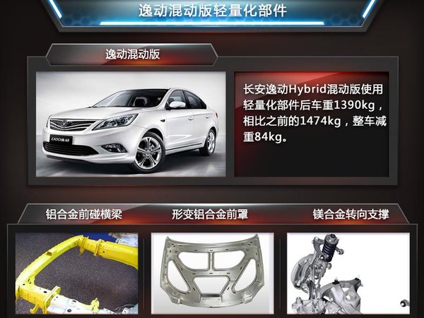 該項目完成中長安逸動混動白車身通過項目組的輕量化設計,車身重量實際從330.7kg減為296.2kg,減重34.5kg,減重率10.4%;集成應用多種輕量化技術,而到了整車試驗車型逸動混動的1390kg,相比原車型1474kg,整車減重84kg,減重率5.7%。