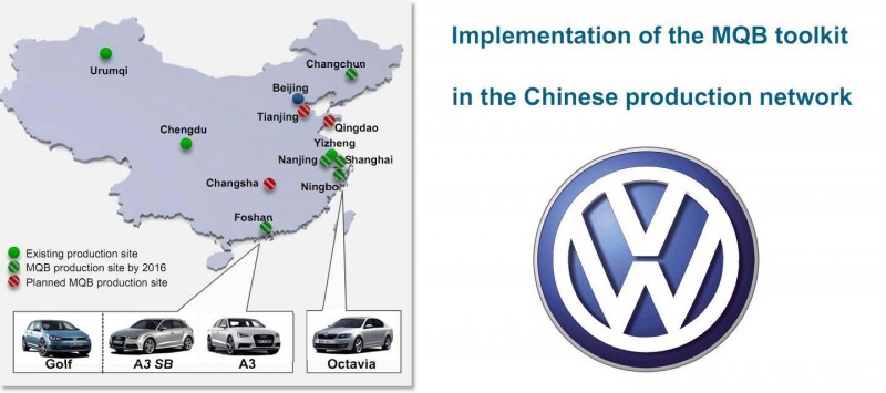 大眾汽車中國本月向投資者提供的資料顯示,在中國的產能網絡中,將有8座工廠投產MQB(Modular Querbaukasten)模塊化發動機橫置平臺衍生的車型。作為對比,2013年5月大眾在華簽約上海大眾長沙工廠時,資料中給出的MQB工廠數量為3座。