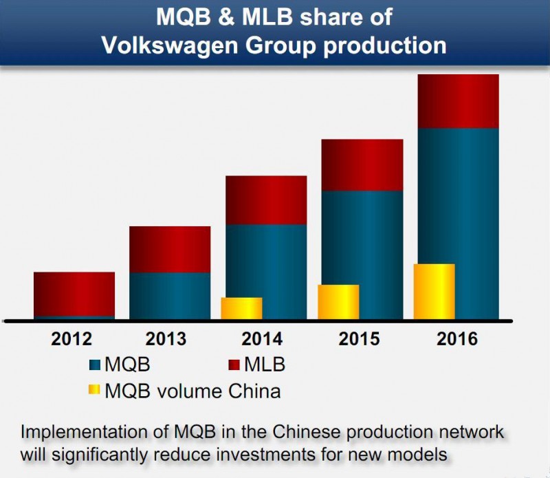 MQB平臺推廣后,發動機和變速箱的型號最多甚至可以減少90%。該平臺用于大眾、奧迪、西雅特、斯柯達等數個品牌多達60款車型,包括第七代高爾夫、奧迪Q3、CrossBlue、第八代帕薩特、第二代途觀等。