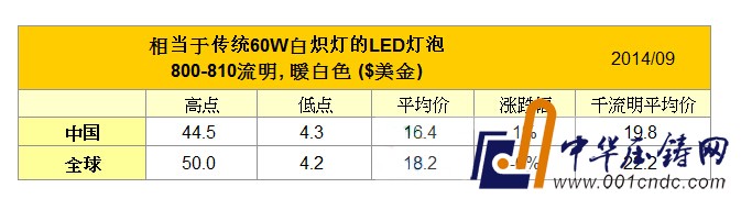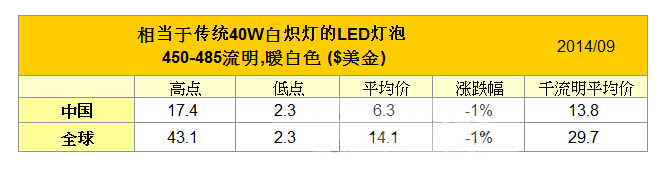 根據研究機構集邦科技(TrendForce)旗下的LEDinside最新LED燈泡零售價調查顯示,今年(2014年)9月,全球取代40W的LED燈泡零售均價2014年9月份呈現約0.6%小幅下降,達到14.1美元。取代60W的LED燈泡全球均價呈現5.9%下降,達到18.2美元。其中德國地區價格下跌較為明顯。