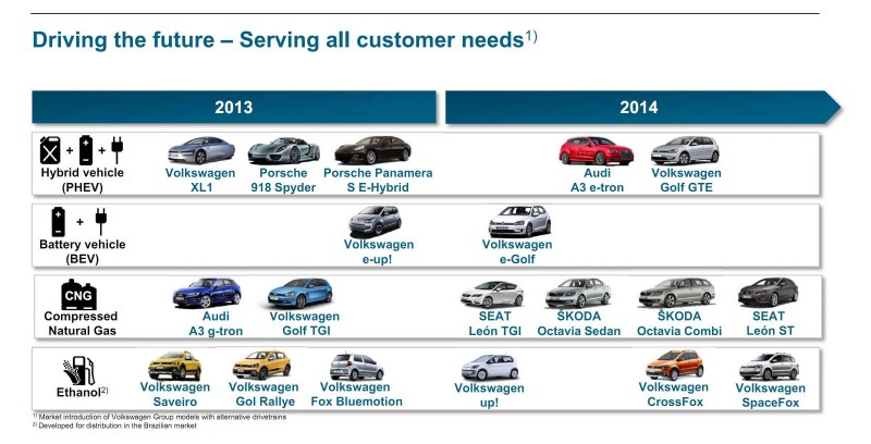 大眾在全球推廣新能源車的力度同樣頗為可觀。根據(jù)該集團(tuán)CEO馬丁·文德恩( Martin Winterkorn)在去年法蘭克福車展發(fā)布的規(guī)劃,到2014年大眾將生產(chǎn)14款采用替代型動(dòng)力總成的新能源車,倘若未來市場需求增長,則有望推出多達(dá)40款搭載替代型動(dòng)力總成的新能源車。