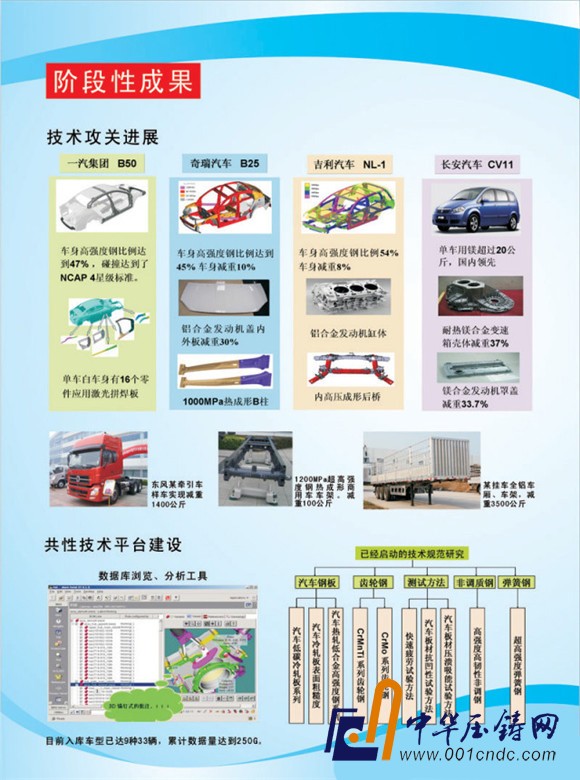 近幾年,隨著2011年以中國汽車工程學會牽頭的汽車輕量化技術創新戰略聯盟成立,一批國家科技支撐計劃——“汽車關鍵輕量化技術開發與整車的集成應用”課題也相繼由聯盟內各企業和科研院所與大學承擔。目前,聯盟已經完成的課題包括:車身參數化輕量化設計及應用,超高強度鋼熱沖壓成形技術開發及應用,高強度鋼先進成形技術開發及應用,纖維增強塑料前端模塊開發及應用,形變鋁合金應用技術開發及應用,輕量化共性技術平臺建設等,并且這些成果已經在包括一汽、東風、長安、北汽、奇瑞、吉利、長城等企業的多個車型上。