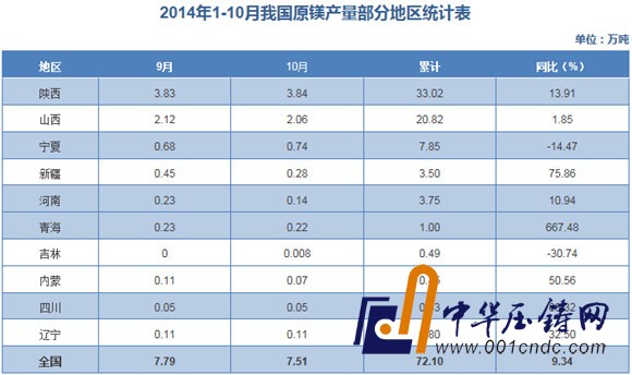中國(guó)有色金屬工業(yè)協(xié)會(huì)統(tǒng)計(jì)數(shù)據(jù)顯示,2014年1-10月,中國(guó)原鎂產(chǎn)量累計(jì)72.10萬噸,同比增9.34%。(具體見下表)