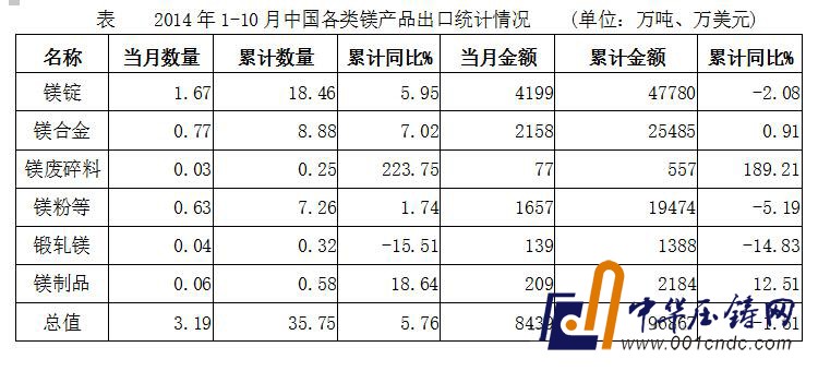 據海關總署統計數據顯示,2014年1-10月中國累計出口各類鎂產品共35.75萬噸,同比增長5.76%,累計金額9.69億美元,同比減少1.51%。其中鎂錠累計出口18.46萬噸,同比增長5.95%;鎂合金累計出口8.88萬噸,同比增長7.02%;鎂粉累計出口7.26萬噸,同比增長1.74%。