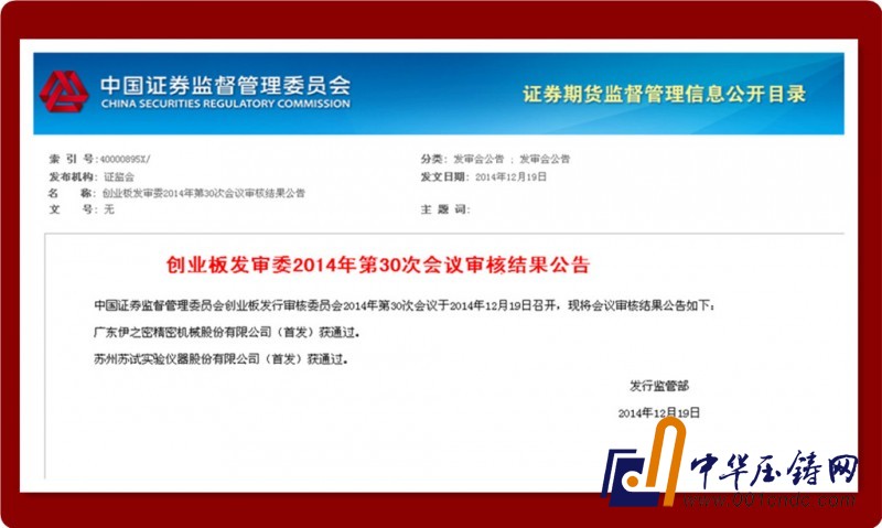 十年磨一劍!在經歷兩年多的漫長等待后,伊之密IPO項目終于得以順利過會,有望成為第一家在深交所創業板上市的模壓成型裝備制造企業。2014年12月19日,在中國證監會創業板發行審核委員會召開的2014年第30次工作會議上,廣東伊之密精密機械股份有限公司IPO申請獲得無條件通過。至此,伊之密登陸深交所創業板已完成最重要的一個階段。