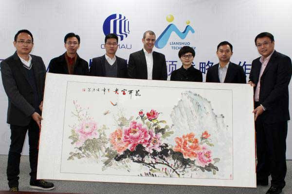 友好的氣氛下成功簽署2015柯馬與深圳連碩戰略合作協議,深圳連碩自動化科技股份有限公司將代表花開富貴的牡丹圖贈與柯馬,表達了對未來合作的美好祝愿。