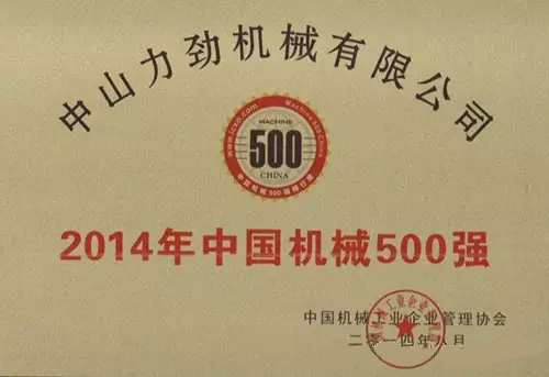 中山力勁機械有限公司被評為2014年度“中國機械500強”。迄今為止,力勁集團子公司已連續9年獲評“中國機械500強“;