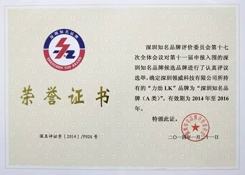 深圳領威科技有限公司“力勁LK”商標認定為第十一屆“深圳知名品牌”;