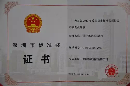 深圳領威科技有限公司主導起草的《鎂合金冷室壓鑄機》國家標準榮獲“深圳市科學技術獎”;