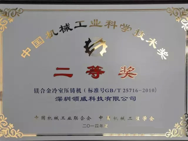 深圳領威科技有限公司主導起草的《鎂合金冷室壓鑄機》國家標準榮獲“中國機械工業科學技術獎二等獎”;