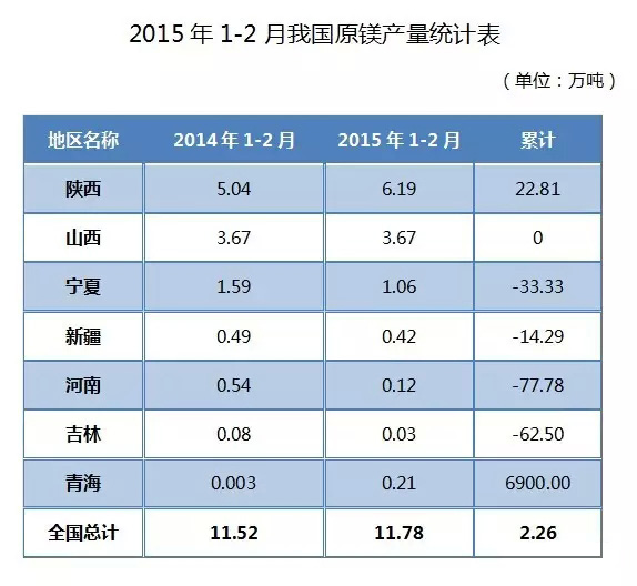 2015年1—2月中國原鎂產(chǎn)量同比微增 陜西累計(jì)生產(chǎn)6.19萬噸繼續(xù)保持高增勢(shì)頭