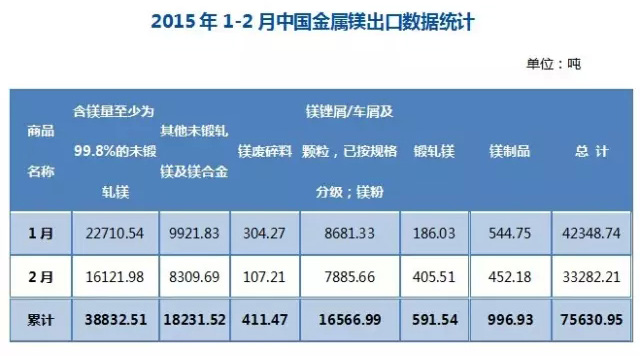 根據(jù)海關(guān)總署最新統(tǒng)計(jì)數(shù)據(jù),2015年1-2月份中國累計(jì)出口鎂75630.95噸,同比增長12.37%。