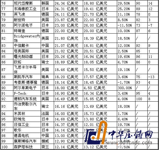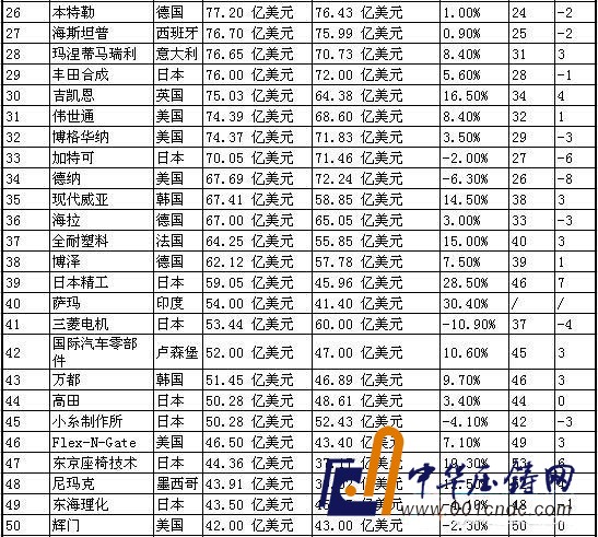 下表為2014年全球汽車零部件配套供應商百強名單: