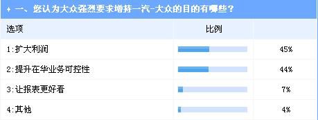 但可以肯定的是,大眾汽車在迫切的等待著最終獲批,其增持一汽-大的目的為何?調查1的結果表明,大眾此舉的目的是要擴大利潤,并提升在華業務的可控性,支持此兩點的參與者分別占比45%和44%。