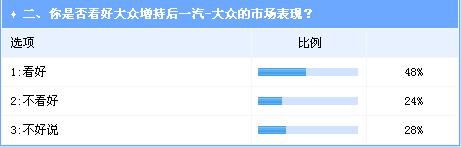 不過,也有參與者并不認為一汽-大眾的市場表現將因大眾汽車的增持而好轉,大眾汽車對中國消費者的傲慢態度已經根深蒂固,大眾方話語權的提升或將進一步制約其在華發展。而且,目前國內市場競爭激烈,車市留個大眾重新做產品布局的空間越來越小,大眾增持對一汽-大眾業績的好轉影響有限。持此觀點者占比24%。