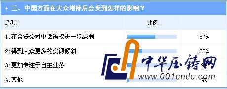 大眾增持一汽-大眾后,中國方面將受到怎樣的影響?調查3對此提出設問,結果表明,直接影響是最大的,中方在合資公司中本就步槍的話語權將進一步被稀釋,持此觀點者過半,占比57%。