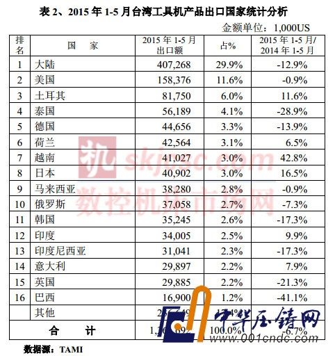 臺灣工具機(jī)產(chǎn)品2015年1-5月出口前十六大市場,大陸排名第一位,出口值4億727萬美元,占全部出口29.9%,較上年同期負(fù)成長12.9%。美國排名第二,出口值1億5,838萬美元,占出口11.6%,較上年同期負(fù)成長0.9%。土耳其第三,出口值8,175萬美元,占出口6.0%,較上年同期成長11.6%,詳如上表2。