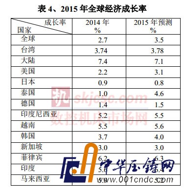 2015年全球預(yù)估成長3.5%,其中臺灣成長3.78%,臺灣機(jī)械出口主要市場大陸成長7.1%,美國3.1%,日本0.8%,泰國4.6%,德國1.5%,印尼5.5%,越南5.6%,韓國4.0%、新加坡3.0%,菲律賓6.3%,印度6.4%,馬來西亞5.2%。詳如下表4。