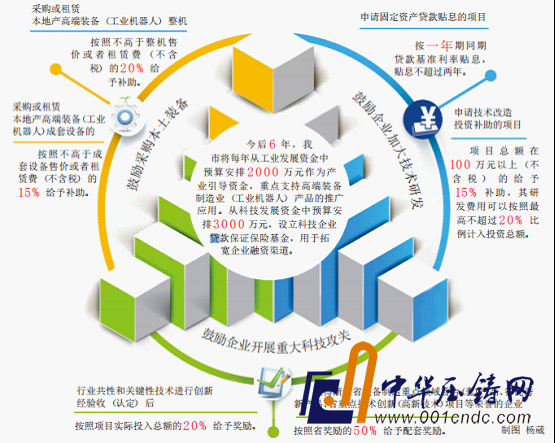 今后6年,我市將每年從工業發展資金中預算安排2000萬元作為產業引導資金,重點支持高端裝備制造業(工業機器人)產品的推廣應用。從科技發展資金中預算安排3000萬元,設立科技企業貸款保證保險基金,用于拓寬企業融資渠道。