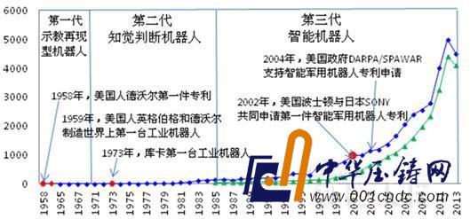 五十多年來工業(yè)機器人經(jīng)歷了可編程示教再現(xiàn)型機器人、知覺判斷機器人、智能機器人三個階段,應(yīng)用領(lǐng)域也逐漸從工業(yè)生產(chǎn)的民用領(lǐng)域轉(zhuǎn)移到軍事領(lǐng)域。本文旨在通過研究機器人領(lǐng)域的全球?qū)@季脂F(xiàn)狀、在華專利申請現(xiàn)狀以及主要競爭對手現(xiàn)狀,從知識產(chǎn)權(quán)的角度揭示我國工業(yè)機器人技術(shù)發(fā)展的機遇與挑戰(zhàn)。