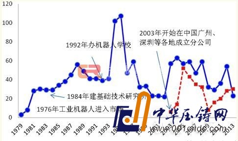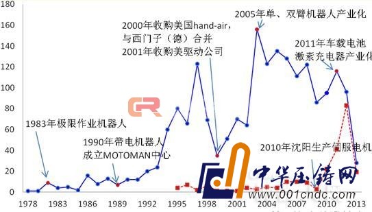 圖5安川電機的專利申請情況(注:藍色為全球?qū)@暾?紅色為在華專利申請)