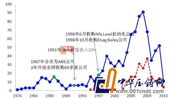 圖8瑞士ABB公司的專利申請情況(注:藍色為全球?qū)@暾?紅色為在華專利申請)