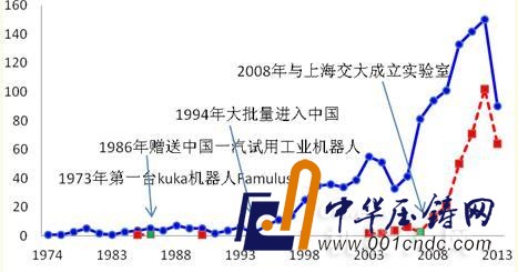 圖7德國KUKA公司的專利申請情況(注:藍色為全球?qū)@暾?紅色為在華專利申請)
