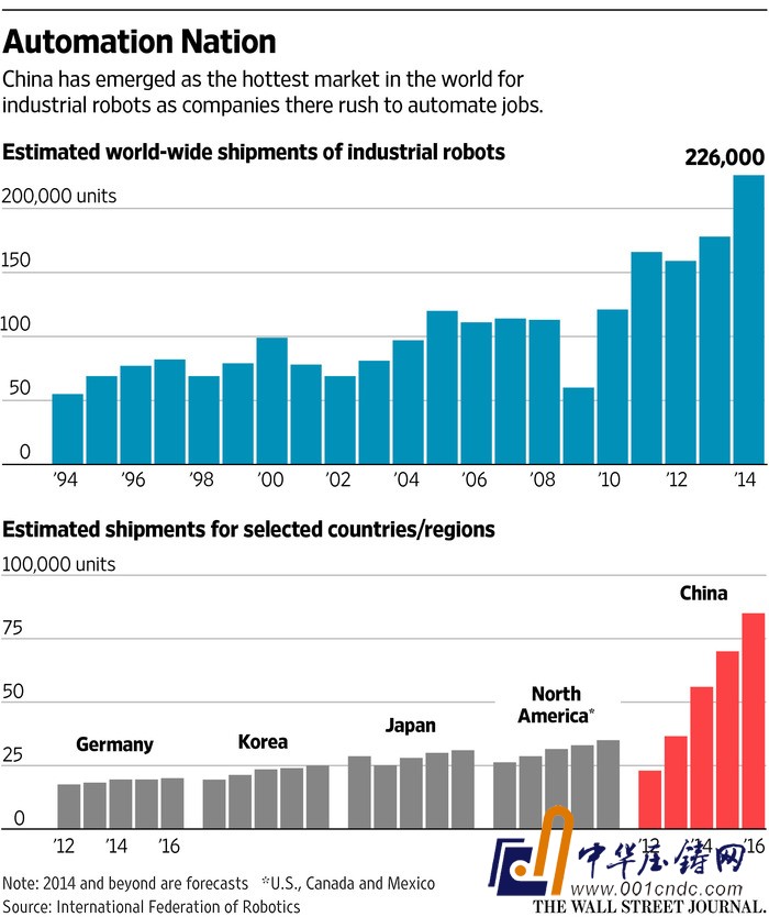 北京時間7月7日消息,美國《華爾街日報》網(wǎng)絡(luò)版今天刊文稱,中國逐步崛起為自動化中心,打破了有關(guān)機器人和全球經(jīng)濟的許多假設(shè),同時也標志著中國經(jīng)濟的重大轉(zhuǎn)型。