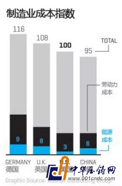 據波士頓咨詢公司估計,現在在美國制造商品的平均成本只比在中國高5%,更令人震驚的是:到2018年,美國制造的成本將比中國便宜2-3%。