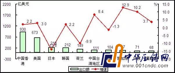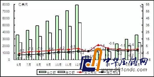 進口方面,電子器件(1372億美元,1.9%)、計算機(259億美元,-8.8%)、電子元件(225億美元,-5.3%)、電子儀器設備(220億美元,-7.9%)、通信設備(227億美元,6.1%)、家用電子電器(91億美元,-4.1%)、電子材料(36億美元,-8.0%)、廣播電視設備(18億美元,-16.8%)。主要產品進口額排前五位的分別是:集成電路(1032億美元,4.0%)、液晶顯示板(196億美元,-6.6%)、手持式無線電話用零件(144億美元,2.5%)、硬盤驅動器(74億美元,0.6%)和印刷電路(57億美元,-3.6%)。