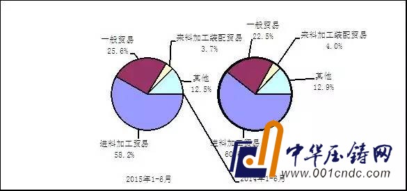 圖3 2015年與2014年1-6月電子信息產品主要貿易方式出口份額對比