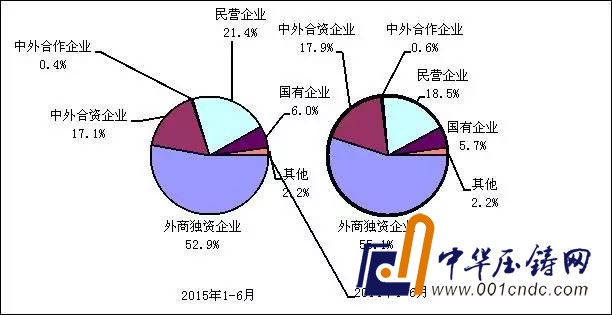 圖4 2015年與2014年1-6月電子信息產品各類企業出口份額對比