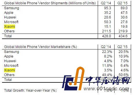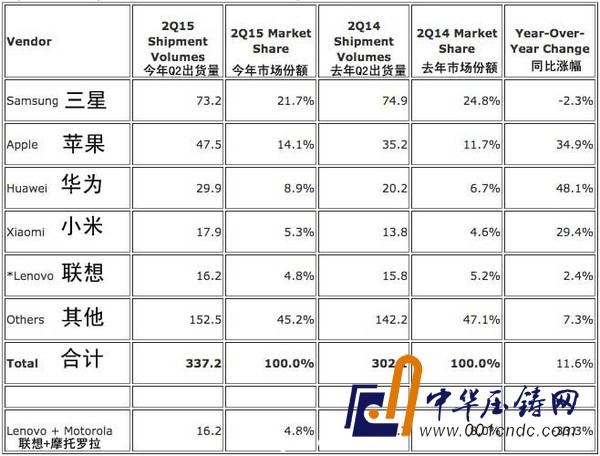 不過,根據此前7月24日市場調研公司IDC公布的2015年第二季度全球手機市場統計報告顯示,今年第二季度智能手機廠商全球出貨量共計3.37億臺,同比去年增長了11.6%,三星、蘋果、華為、小米、聯想(包括摩托羅拉)前五大廠商二季度出貨量達1.85億臺,占據了全球55%的市場份額。