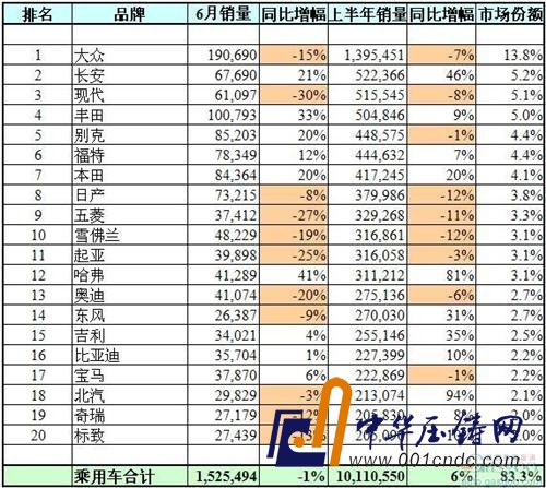 2015年6月份,中國市場乘用車總銷量為1,525,494輛,同比下跌1%;上半年累計銷量10,110,550輛,同比增長6%。乘用車占據整體輕型車市場83.3%的比重。