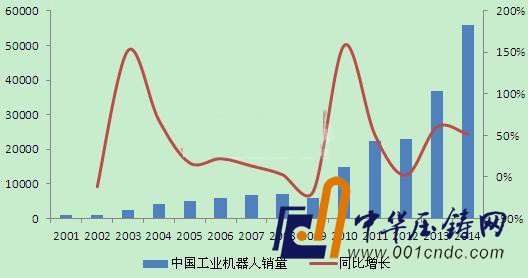 圖表:2001-2014年中國工業(yè)機器人銷量變化情況(單位:臺,%)